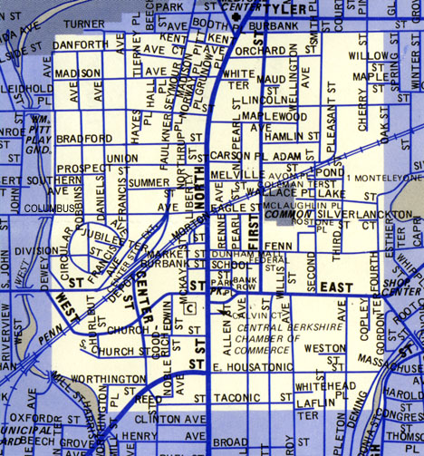 Site fixed November 29, 2009 The Berkshire Museum Camera Club (BMCC), in conjunction with the Berkshire Athenaeum, applied for and received a Pittsfield Cultural Council grant to produce a "Pittsfield Then and Now" display of photographs. Selected photographs from the Berkshire Athenaeum's collection are the "then" photographs. BMCC had architectural photography experts give lectures to its club members. Then the BMCC members produced the "now" photographs. The project culminated with a "Pittsfield Then and Now" show at the Berkshire Athenaeum in January, 2003. Kathleen Reilly and Ruth Degenhardt, current and former head of the Athenaeum's History Department, gave a presentation at the opening of the show on January 18, 2003. The project was limited to the area within a few blocks of Park Square. Fourteen black and white, archival quality photographic prints and six color, archival quality ink jet prints were created. Hundreds of color digital images, color slides, and color prints were created also by BMCC members as part of this project. All of these images have been added to the Athenaeum's collection for reference by future generations. This web site contains a sampling of the then and now images, organized more or less by location in and around Park Square.